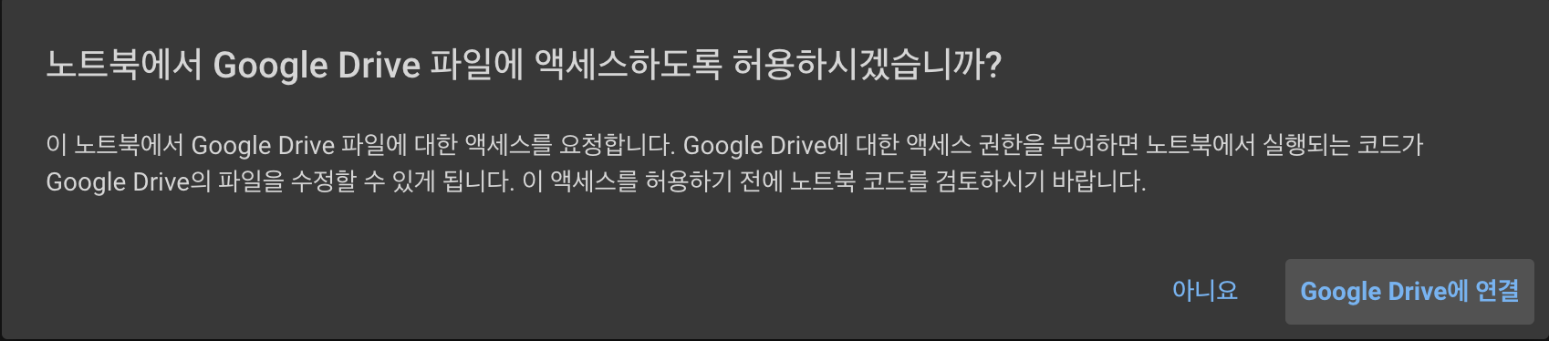 이제 다 왔다. 여기에서 하단의 '허용'을 눌러준다면 colab에서 google drive에 연결이 완료된다.