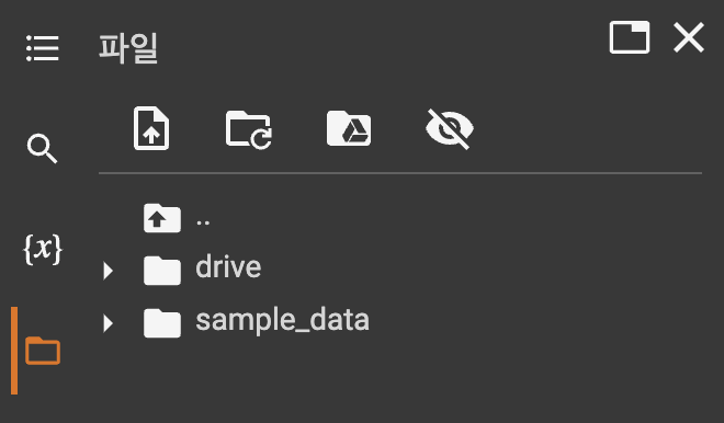 colab 페이지 좌측에 보면 폴더 모양의 아이콘이 보일 것이고, 그것을 누르면 위와같은 화면을 확인 할 수 있다.