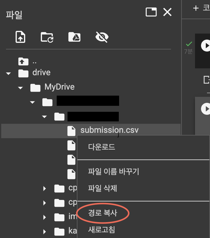 그럼이제 drive를 뒤져서 필요한 파일을 찾아 우클릭-경로복사 를 눌러주자.