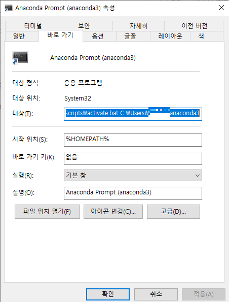 확인을 누르고 다시 Anaconda Prompt를 실행해준다면 짜란~