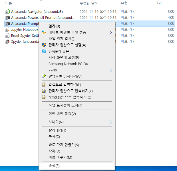 우선 윈도우의 시작버튼을 누르고 anaconda prompt에서 오른쪽 클릭을 한다.