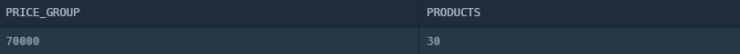 SELECT TRUNCATE(PRICE, -4) as PRICE_GROUP, COUNT(PRODUCT_ID) as PRODUCTS